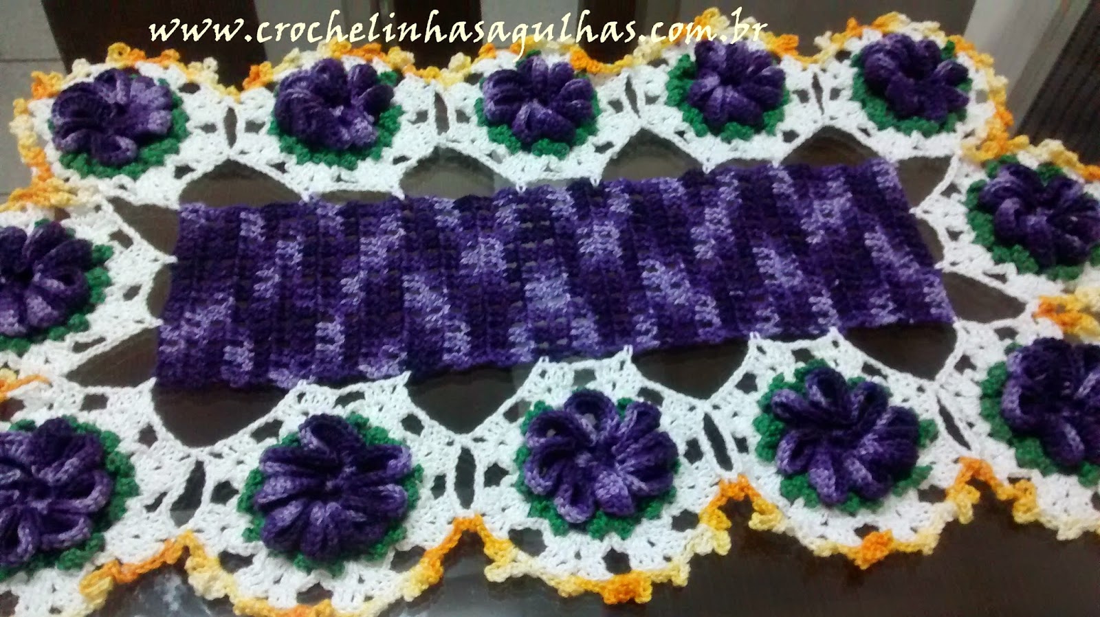 Confeccionei o caminho de mesa em crochê para minha cunhada, baseado no trabalho da crocheteira Andressa Boni: